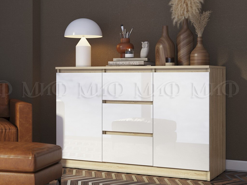 - Комод 1200 2 двери 3 ящика Челси Белый, дуб сонома