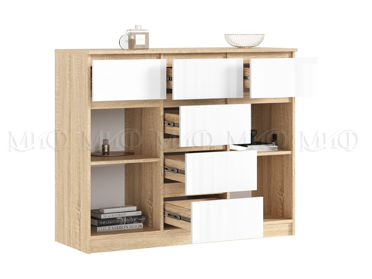 - Комод 1200 (2 двери 6 ящиков) Челси Белый Глянец, Дуб Сонома