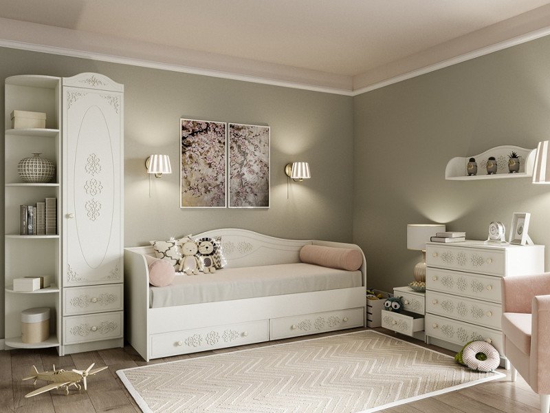 Стоимость зависит от комплектации. Цена указана за комплект на фото: СДУ370.1 Стеллаж угловой, ШД450.1 Шкаф, ДКД2000.1 Кровать с ящиками, КМД800.1 Комод, ТД400.1 Тумба, ПЛД800.1 Полка