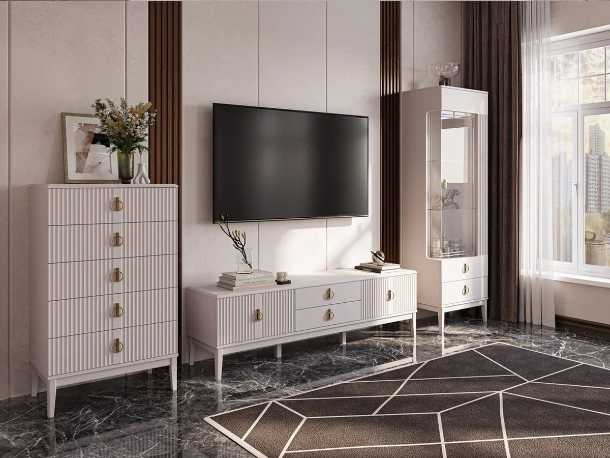 Цена указана за комплектацию на фото: Тумба ТВ, Шкаф с витриной 1-дв. Правый, Комод 5ящиков