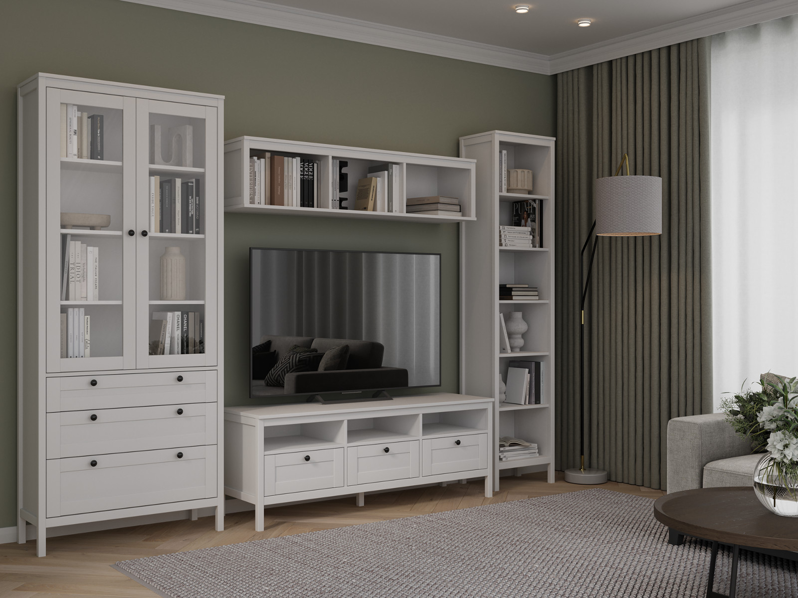 Цена за комплект: Пенал со стеклом, Тумба под ТВ, Шкаф навесной, Пенал книжный узкий