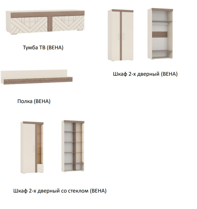 Цена за комплект: Тумба ТВ, Шкаф 2-х дверный, Шкаф 2-х дверный со стеклом, Полка