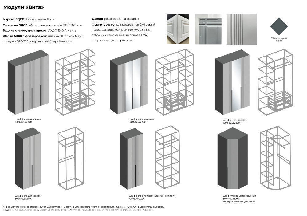 - Фасад: МДФ с фрезеровкой, плёнка ПВХ Силк Маус толщина 320-350 микрон МКМ (с праймером)