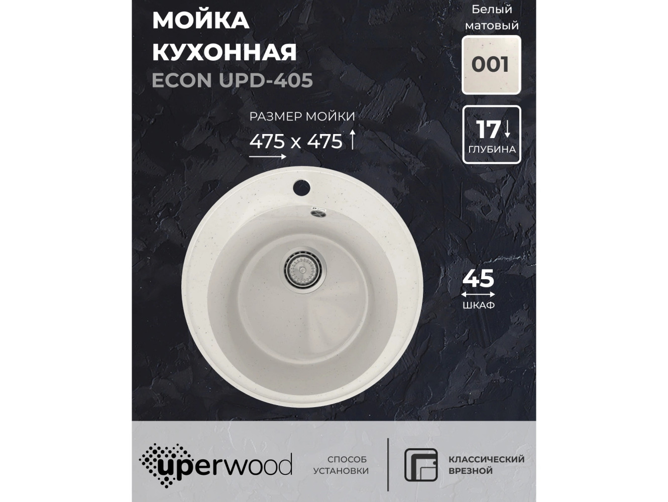 - Кухонная мойка Uperwood ECON UPD-405-001 белая матовая