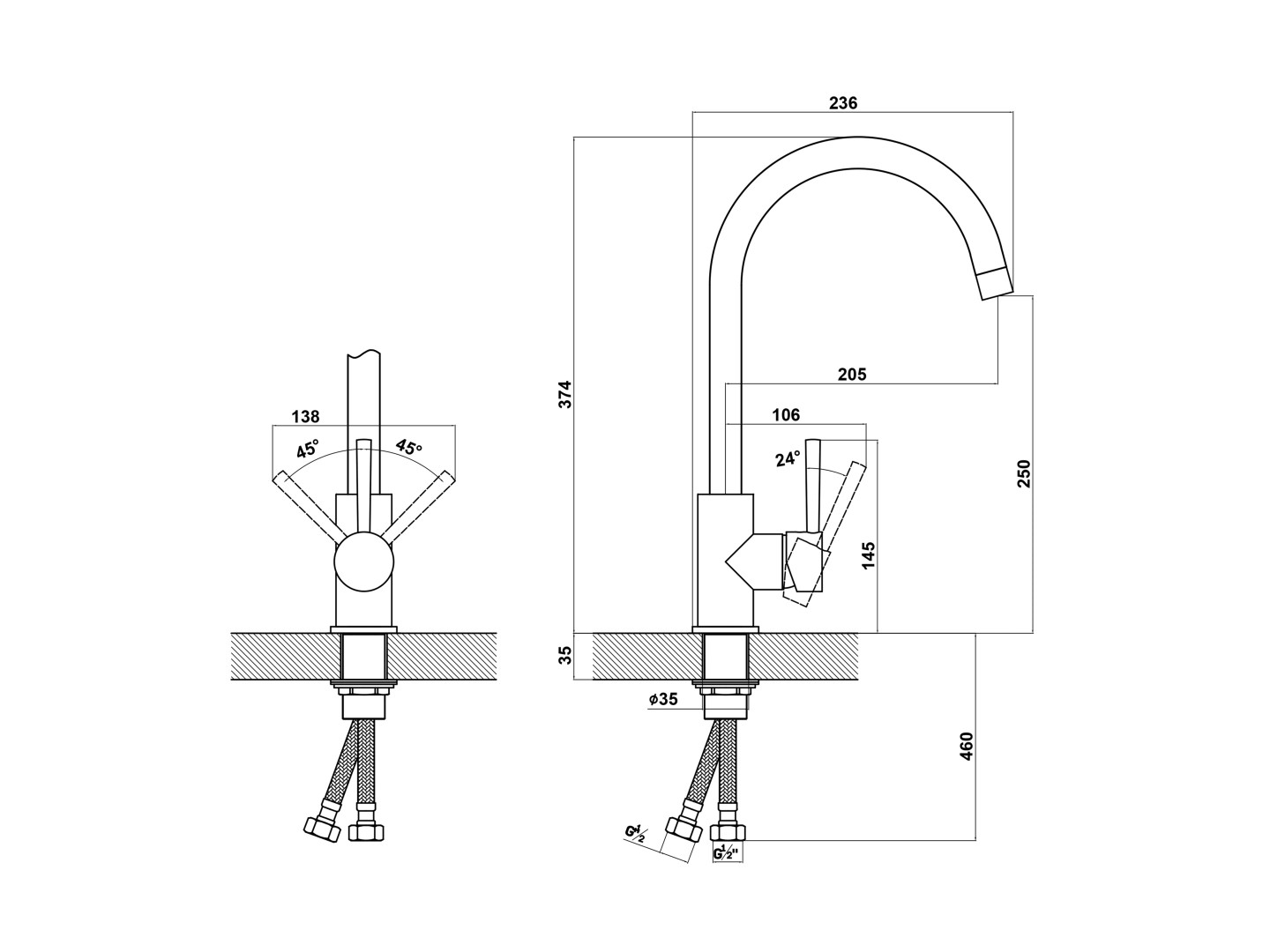 Высокий поворотный излив. Современный дизайн изделия. Гибкая подводка 45 см в комплекте. Усиленная гайка крепления смесителя.