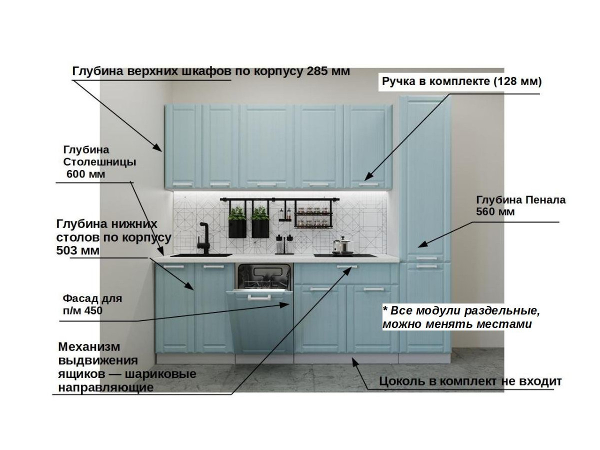 Кухонная мойка, стеновая панель, посудосушитель, планки для столешницы в комплект не входят.