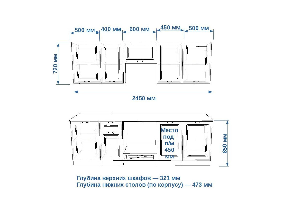 Кухонная мойка, стеновая панель, посудосушитель, планки для столешницы в комплект не входят.