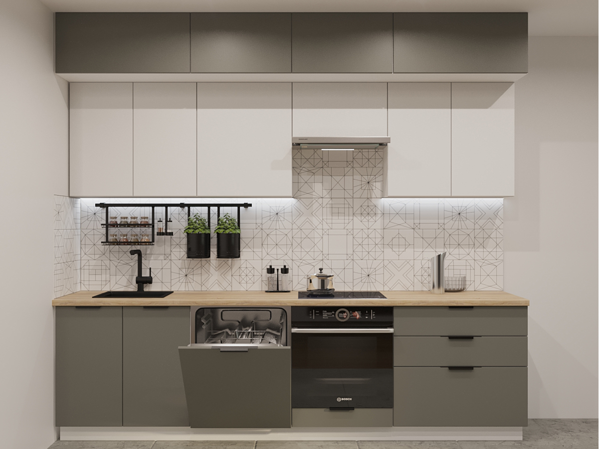 Кухонная мойка, стеновая панель, посудосушитель, планки для столешницы в комплект не входят.