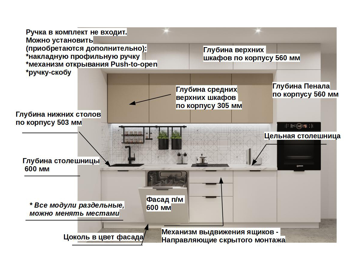 Кухонная мойка, стеновая панель, посудосушитель, планки для столешницы в комплект не входят.
