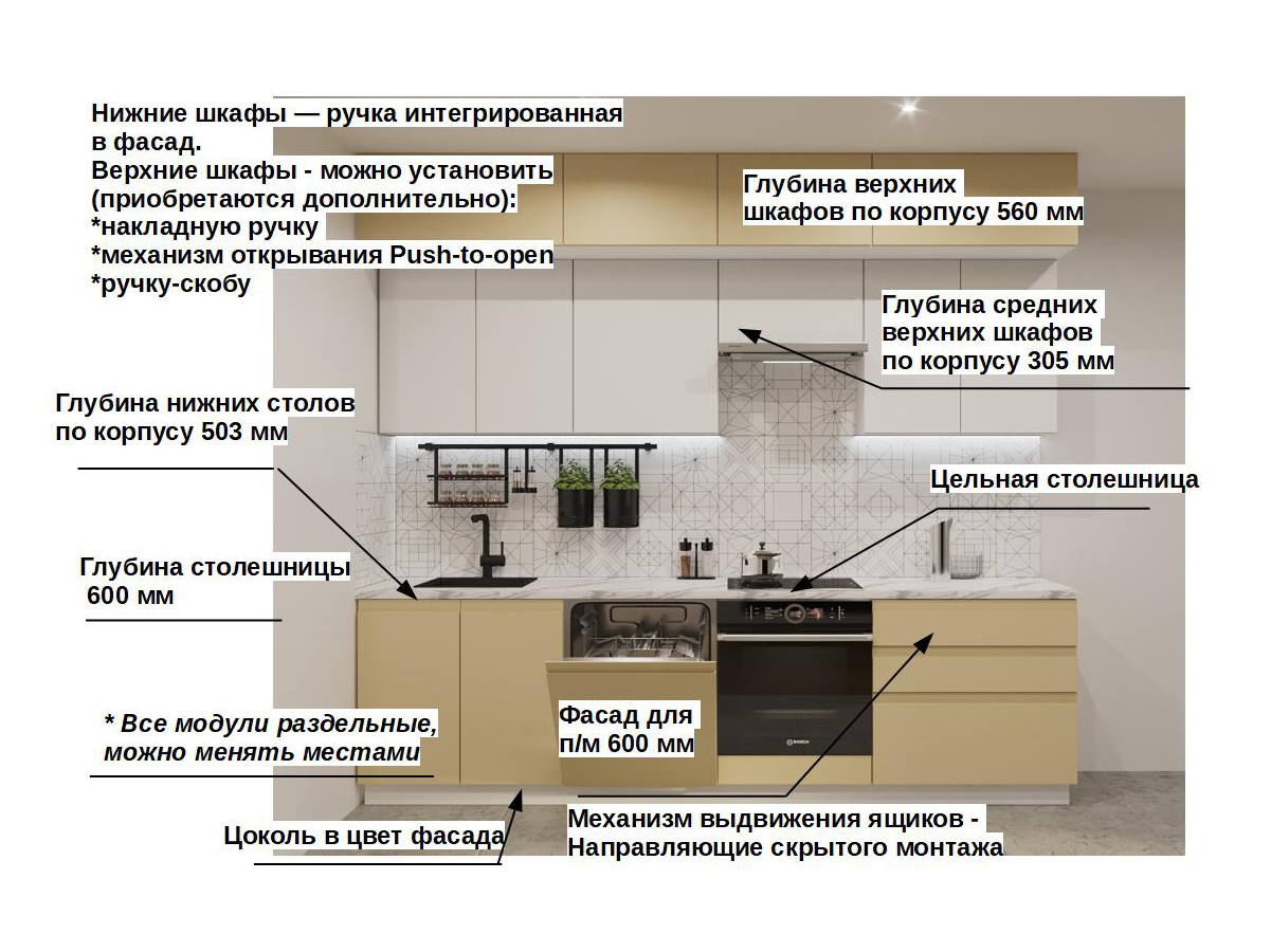 Кухонная мойка, стеновая панель, посудосушитель, планки для столешницы в комплект не входят.