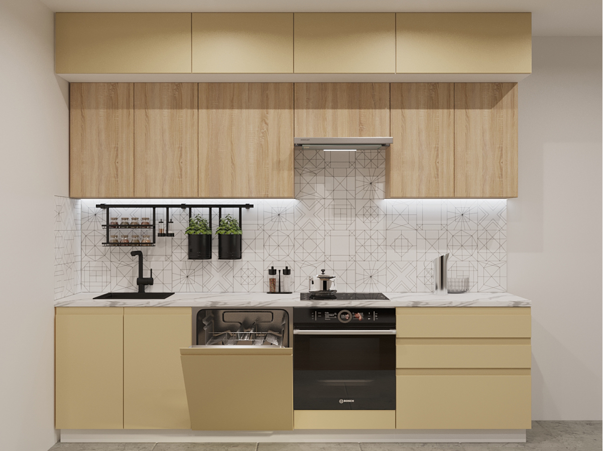 Кухонная мойка, стеновая панель, посудосушитель, планки для столешницы в комплект не входят.