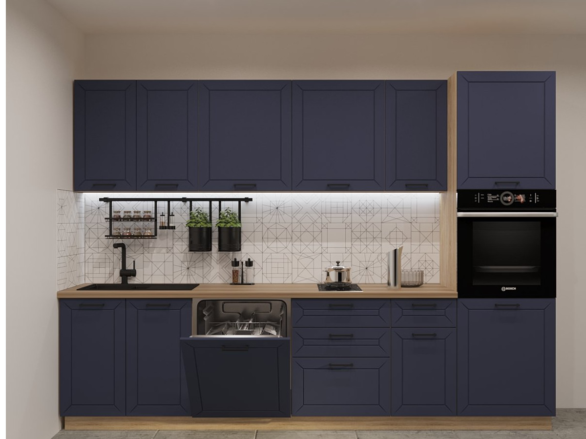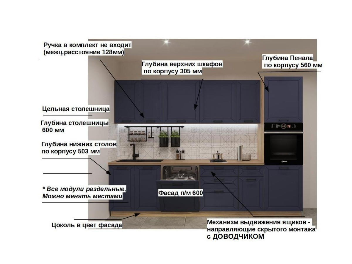 Кухонная мойка, стеновая панель, посудосушитель, планки для столешницы в комплект не входят.