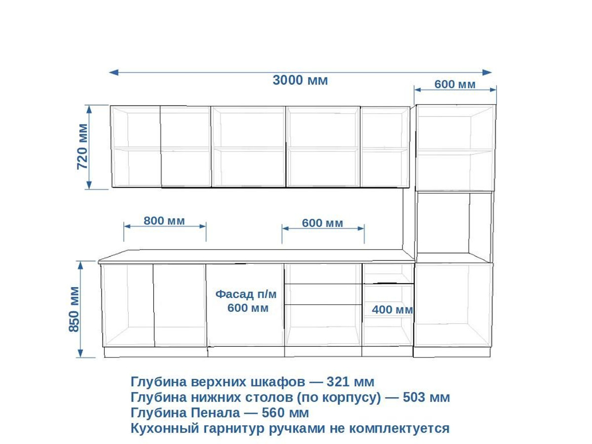 - высота верхних шкафов 720 мм