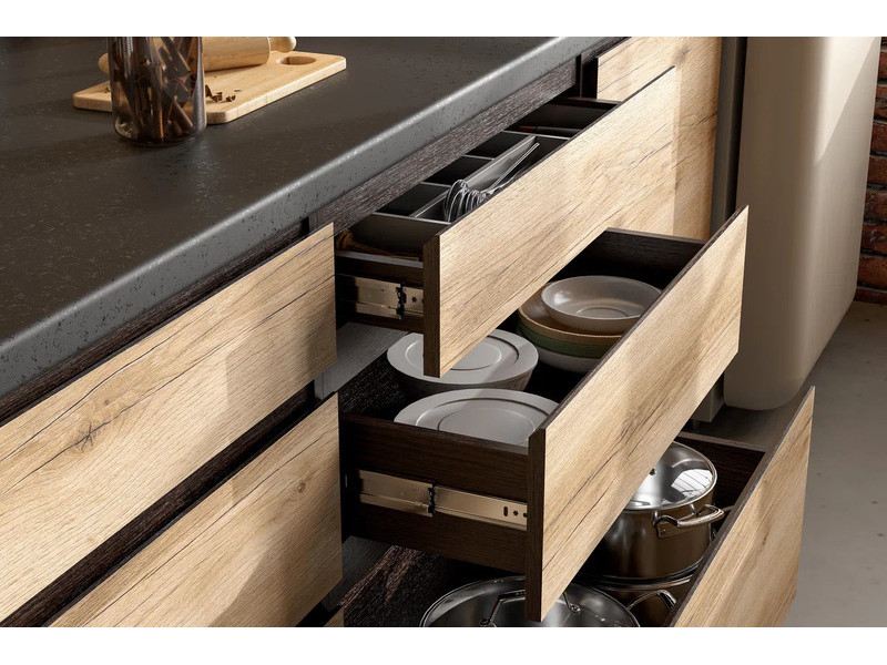 Продуманная система хранения нижних ящиков разделочного стола. Два нижних модуля оборудованы тремя выкатными ящиками на шариковых направляющих полного выдвижения, что позволяет хранить кухонную утварь эргономично и по габаритам. Два верхних модуля с подъемными створками на газлифтах обеспечивают раздельное хранение продуктов и кухонного инвентаря. Верхний модуль шириной 600 мм с распашной створкой замыкает ключевую функцию кухонного гарнитура – хранение посуды.