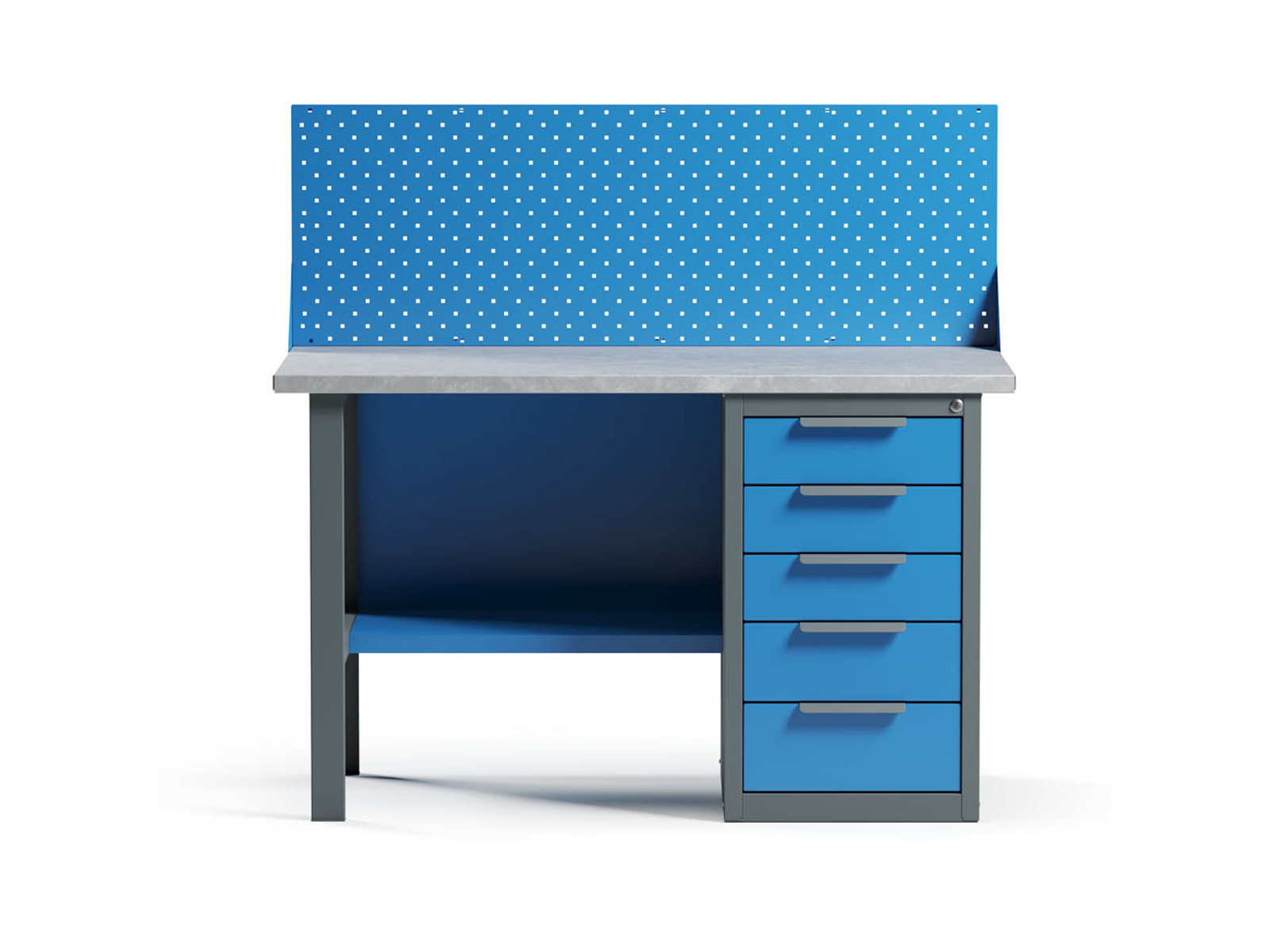Верстак имеет надежную модульную конструкцию с усиленной столешницей (плита МДФ 25мм, покрытая листом оцинкованного металла).