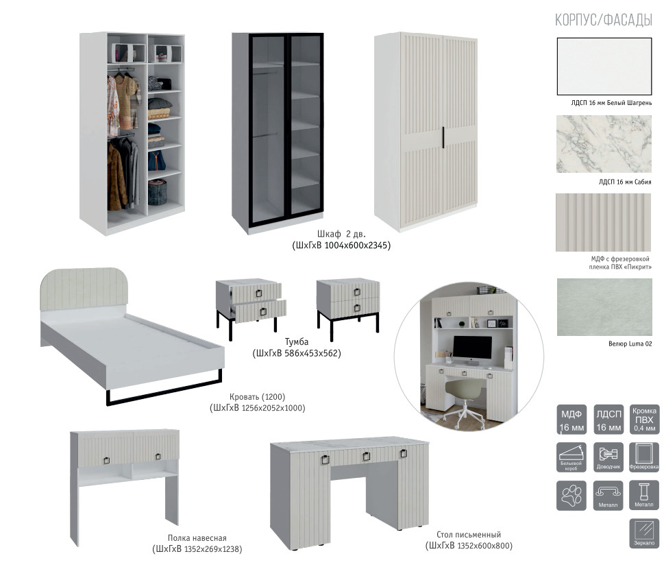Цена за комплект: Кровать (1600), Тумба, Стол туалетный, Комод, шкафа 4 двери, Двери глухие 4 шт