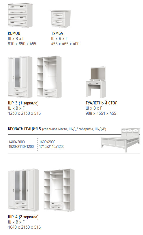 Цена за комплект: кровать ГРАЦИЯ-5 1400 мм, Комплектующие на кровать с ламелями 1400 мм, шкаф ШР-4 2 зеркалом, комод 4 ящика, тумба прикроватная