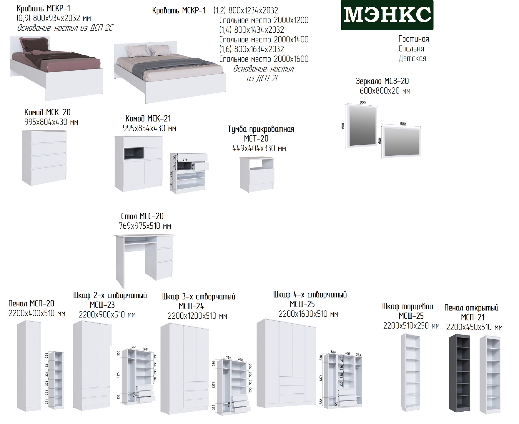 Цена за комплект: МСКР-1 Кровать 1,6м, МСЗ-20 Зеркало, МСК-20 Комод, МСП-20 Пенал, МСТ-20 Тумба прикроватная, МСШ-22 Шкаф торцевой, МСШ-25 Шкаф