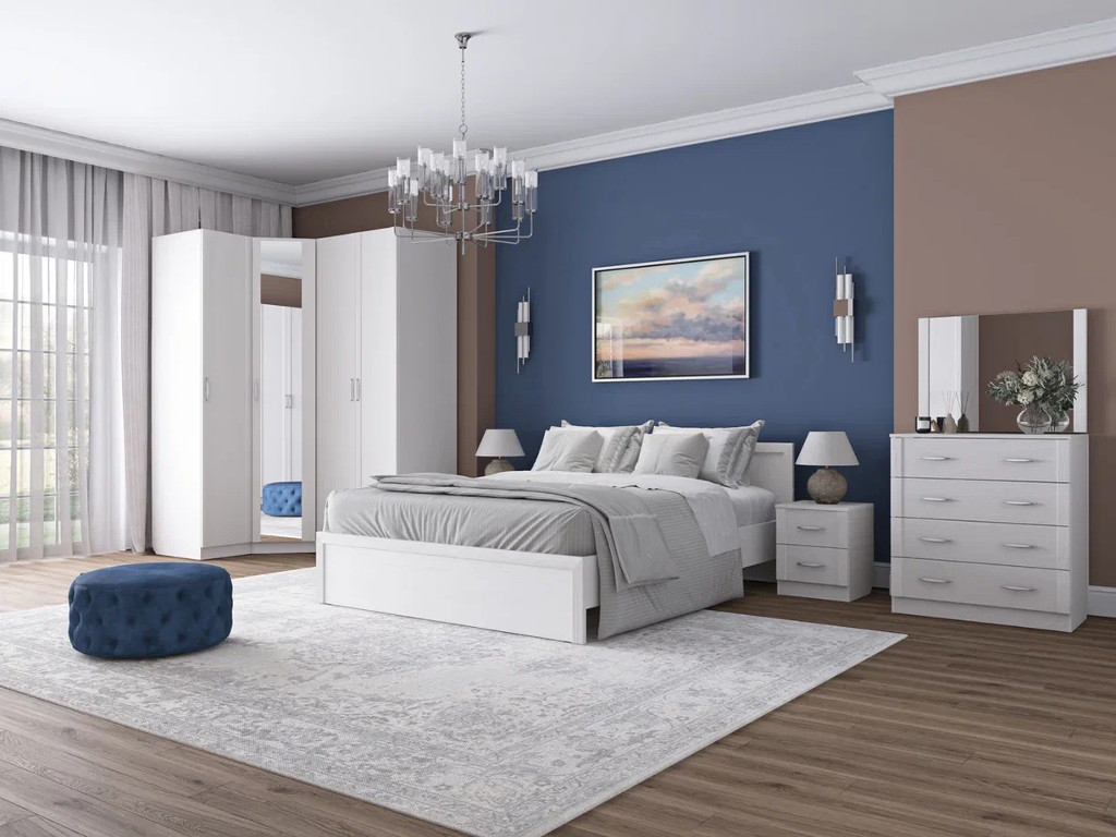 Цена за комплект: Шкаф-пенал, Шкаф угловой зеркало, Шкаф для одежды 2 двери, Тумба, Кровать (1400), Орт. основание неразборное 1400, Зеркало, Комод 4 ящика