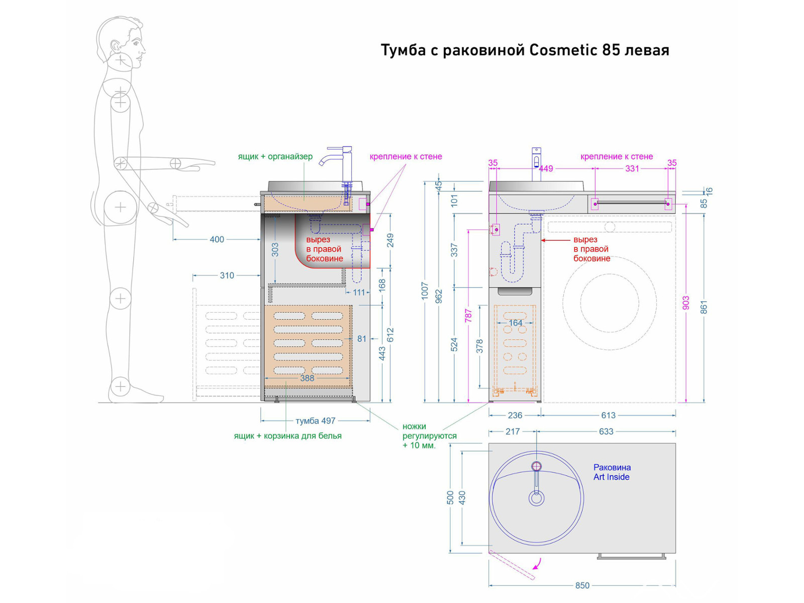 - Тумба с раковиной Cosmetic 85 белая левая