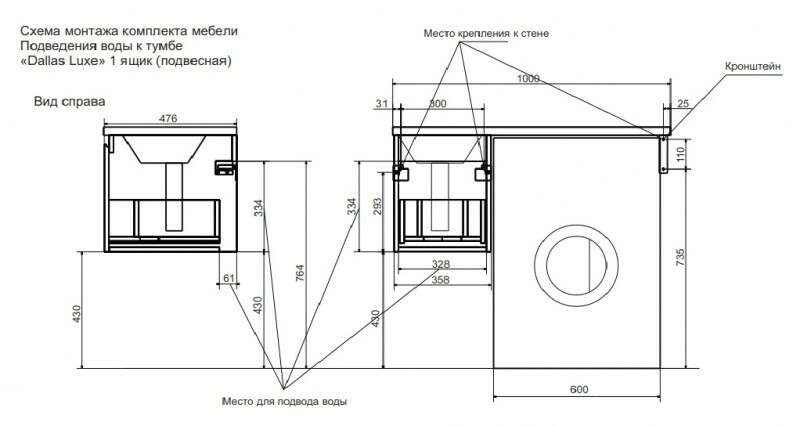 - Тумба с раковиной Dallas Luxe 1000 навесная 1 ящик левая