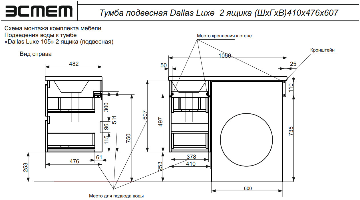 - Тумба с раковиной Dallas Luxe 1050 навесная 2 ящика левая