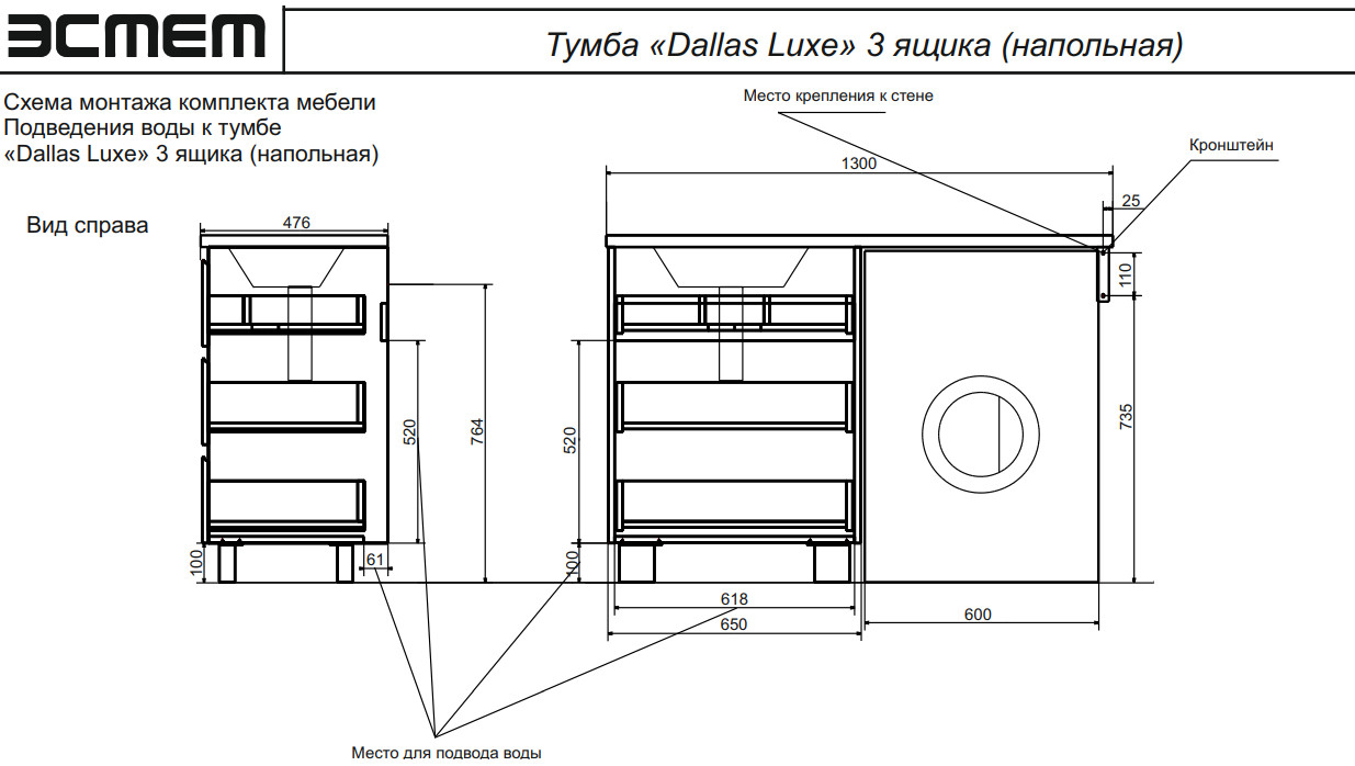 Тумба с раковиной Dallas Luxe 1300 напольная 3 ящика левая