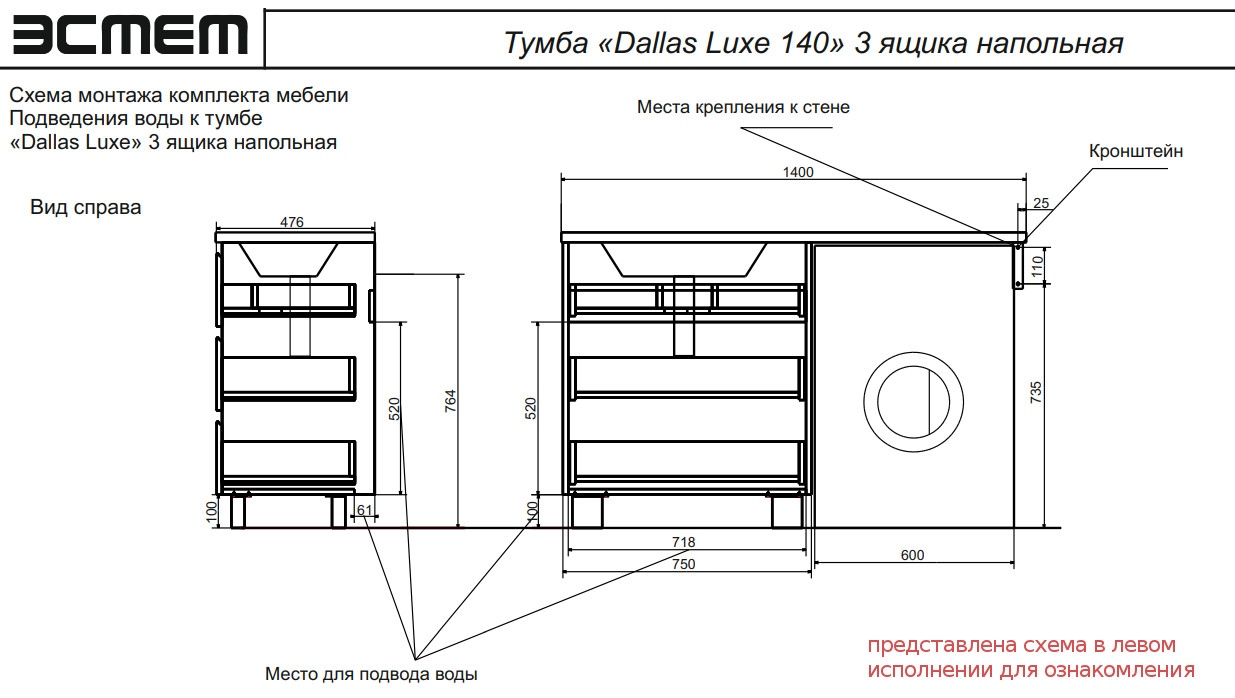 - Тумба с раковиной Dallas Luxe 1400 напольная 3 ящика правая