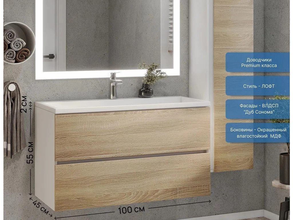 Фасад - ЛДСП в пленке под дерево, цвет дуб сонома. Выдвижные ящики изготовлены из влагостойкой ЛДСП. Ящики оснащены доводчиками. Фурнитура и доводчики премиум класса.