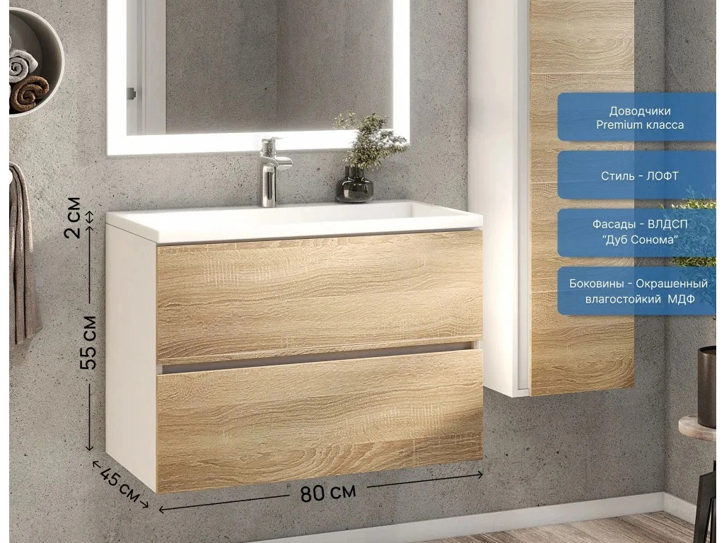 Фасад - ЛДСП в пленке под дерево, цвет дуб сонома. Выдвижные ящики изготовлены из влагостойкой ЛДСП. Ящики оснащены доводчиками. Фурнитура и доводчики премиум класса.