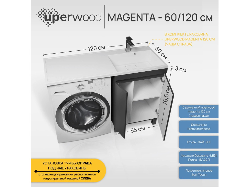 - Тумба с раковиной Uperwood Magenta 60-120 см напольная черная с дверцами правая
