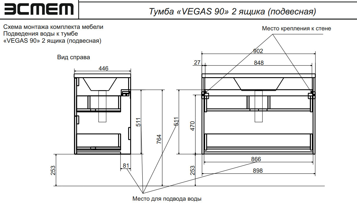 - Тумба с раковиной Vegas 900 навесная 2 ящика