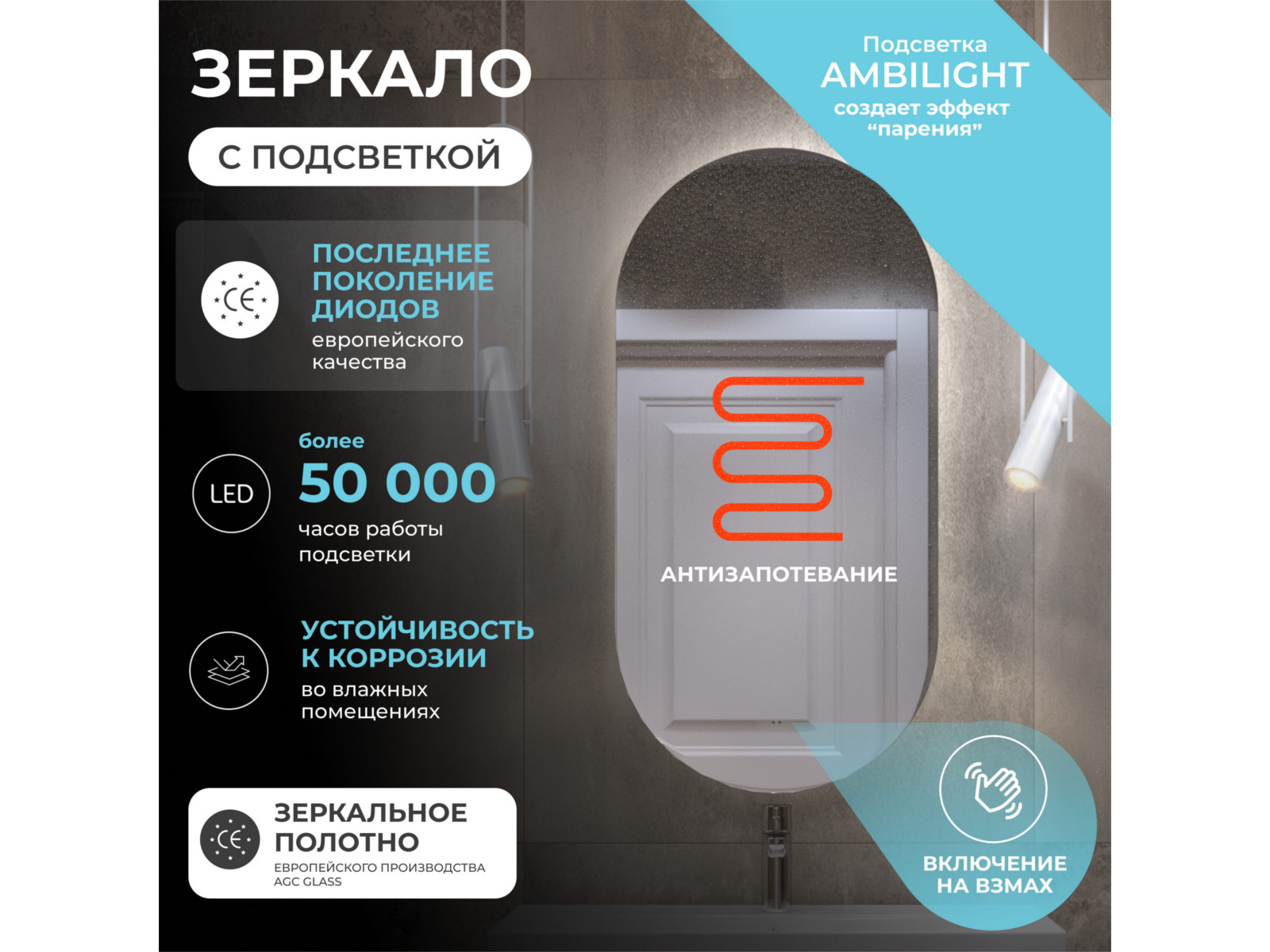 Подсветка Ambilight за полотном по периметру, с цветовой температурой 5000К – нейтральный белый, управление подсветкой бесконтактный выключатель «на взмах»