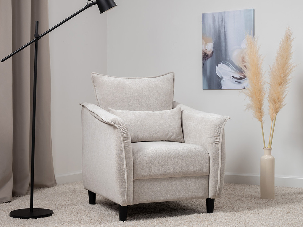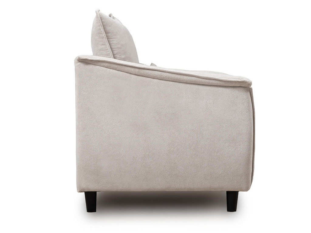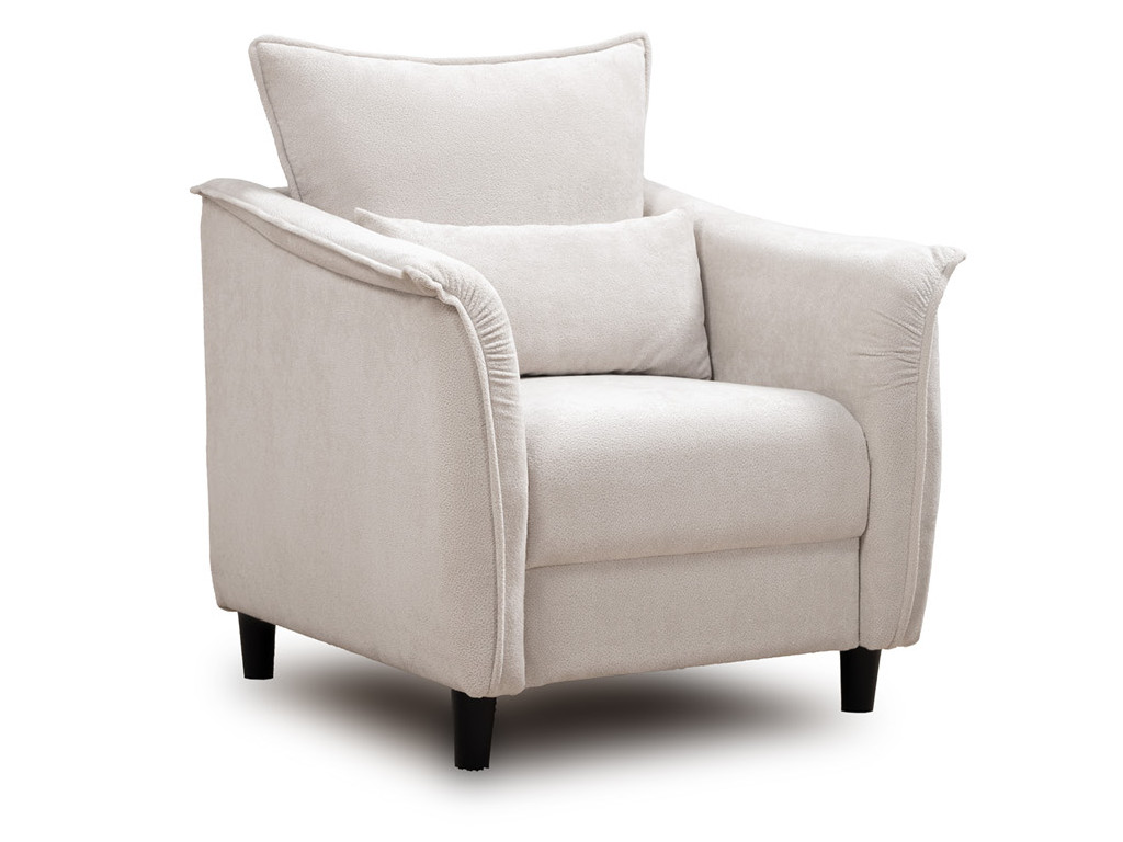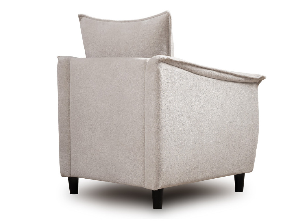 Кресло с приспинной подушкой трапецивидной формы на молнии, по трем сторонам которой проложена отделочная строчка на 1,2 см. По контуру боковин проложен декоративный кант на 1,2 см основной ткани. Кант проходит по центру передней части боковины, а по внутренней верхней части сборка.