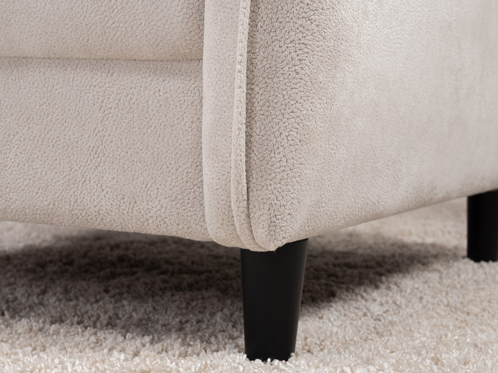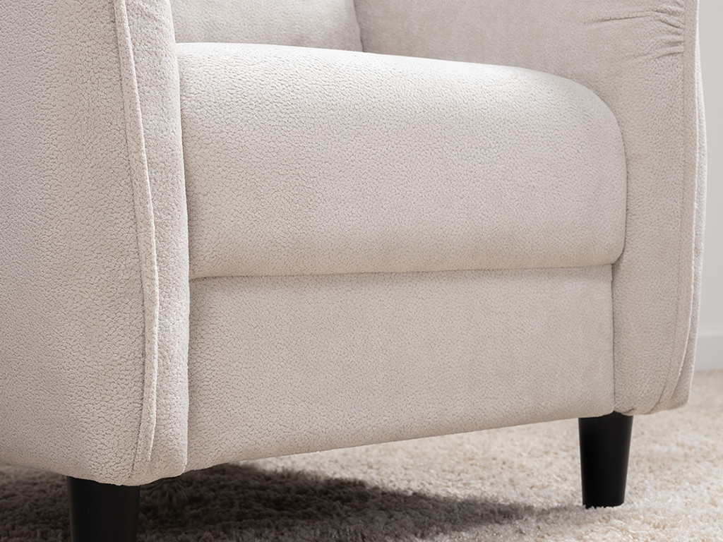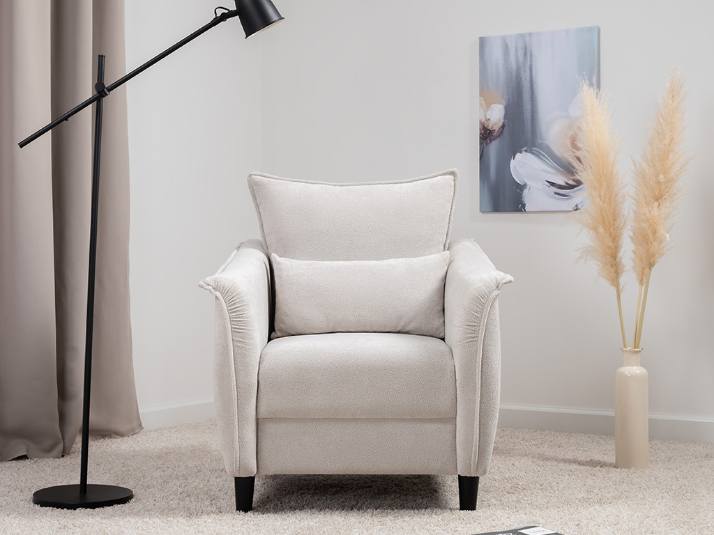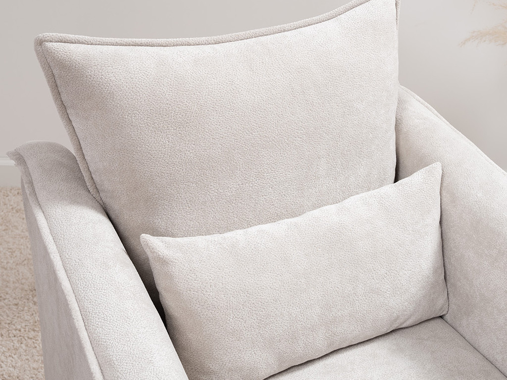 Кресло с приспинной подушкой трапецивидной формы на молнии, по трем сторонам которой проложена отделочная строчка на 1,2 см. По контуру боковин проложен декоративный кант на 1,2 см основной ткани. Кант проходит по центру передней части боковины, а по внутренней верхней части сборка.
