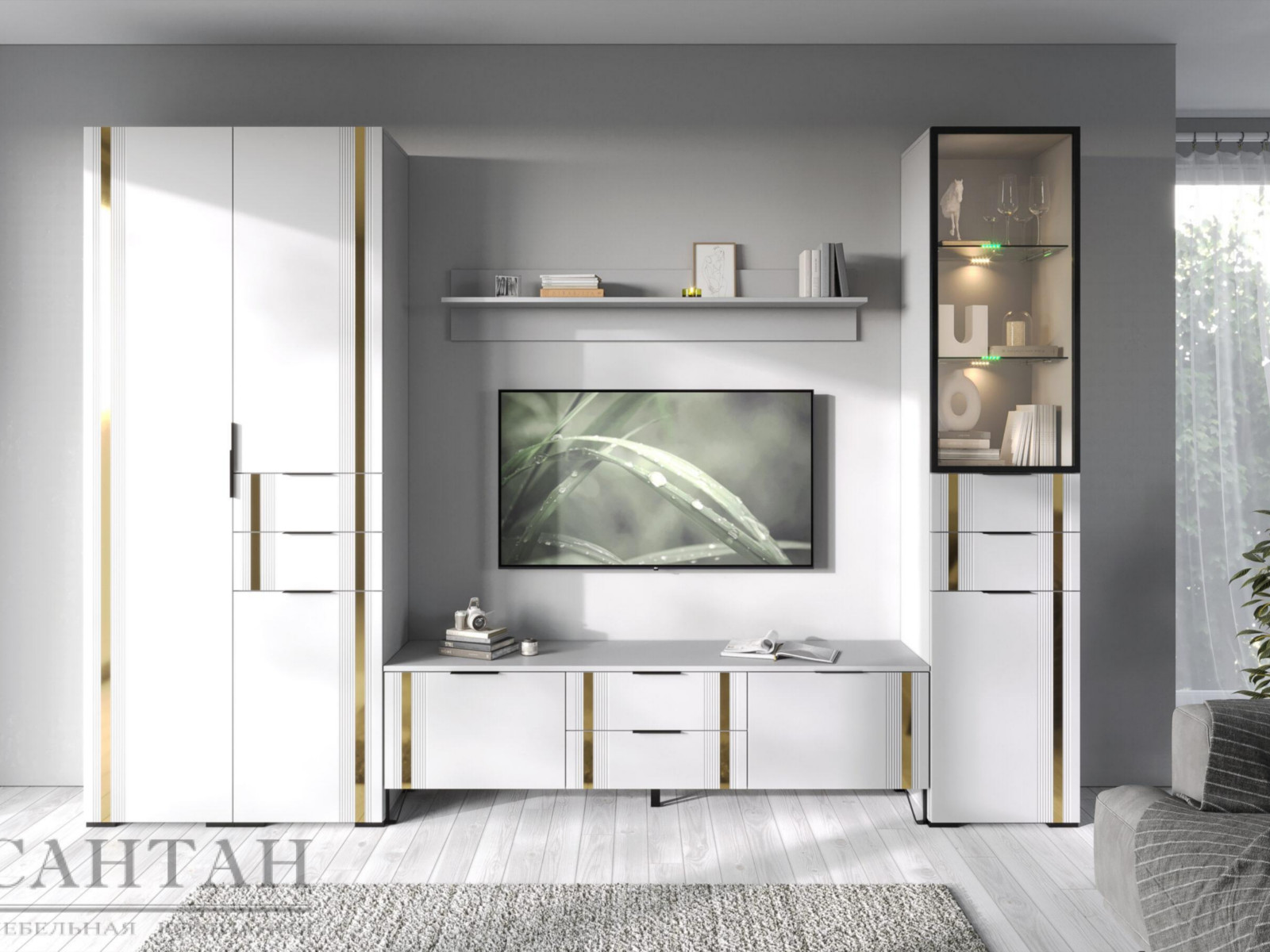 - Фасады МДФ украшены декоративной металлической лентой в цвете "Золото браш".