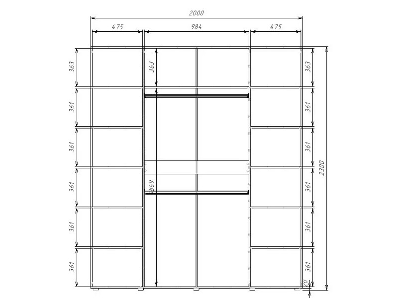 - Шкаф комбинированный с полками по краям и 2 штангами в центре Гранд ГШК/2-23-20-3333