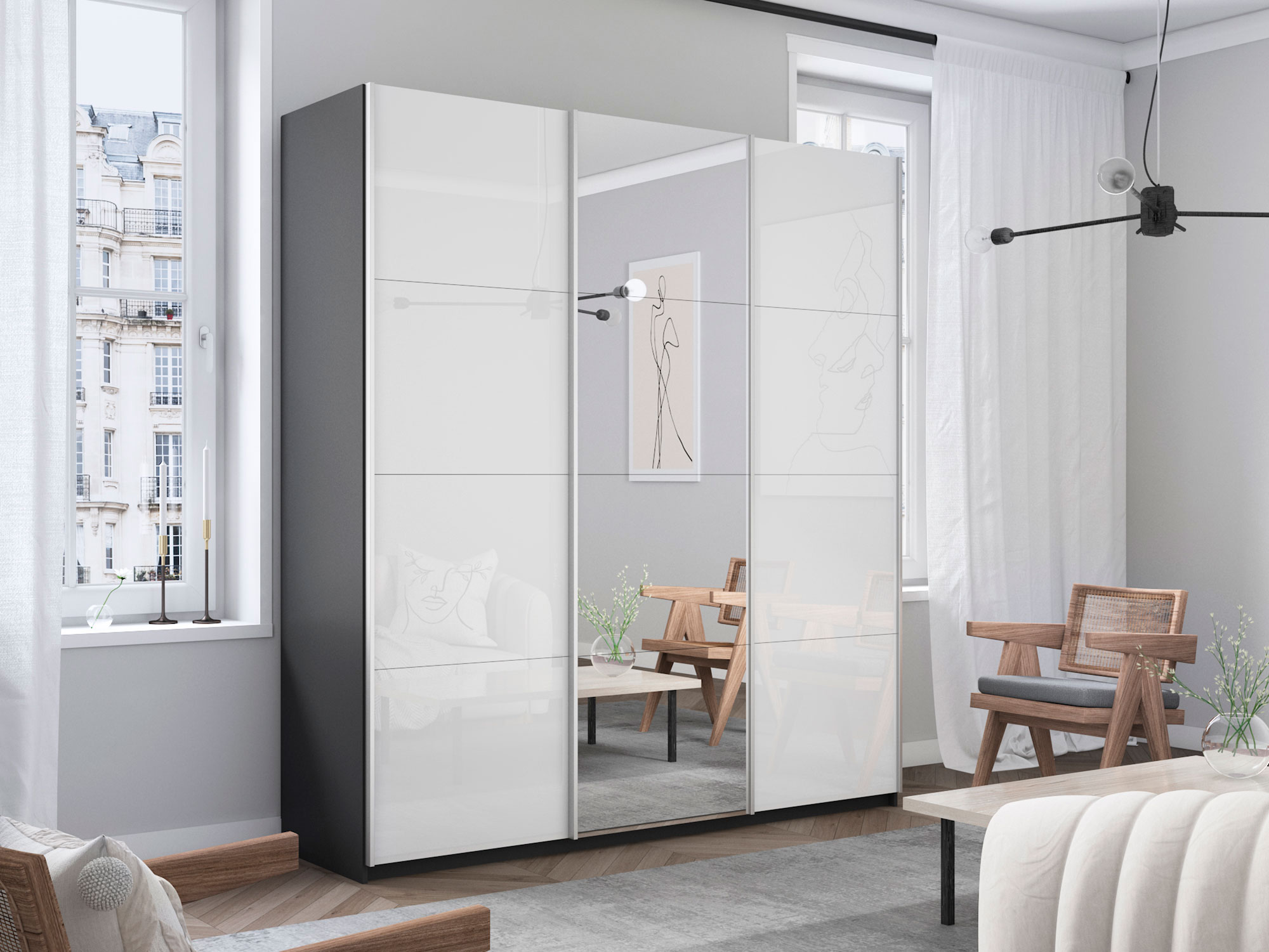 - Шкаф-купе Прайм 3-х дверный 1800 два Стекла Белые/Зеркало Серый Диамант