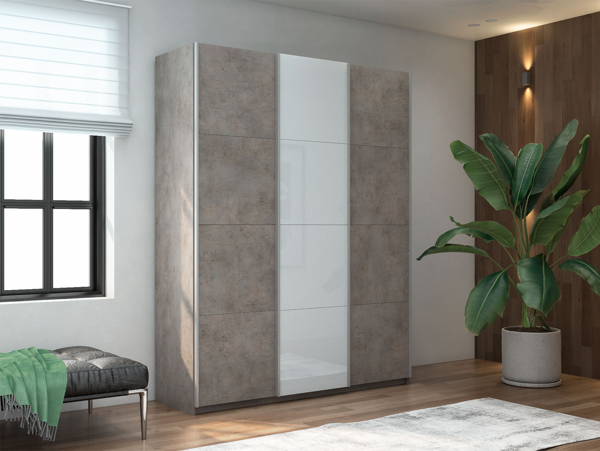 - Шкаф-купе Прайм 3-х дверный 2100 ДСП/Стекло Белое/ДСП Бетон