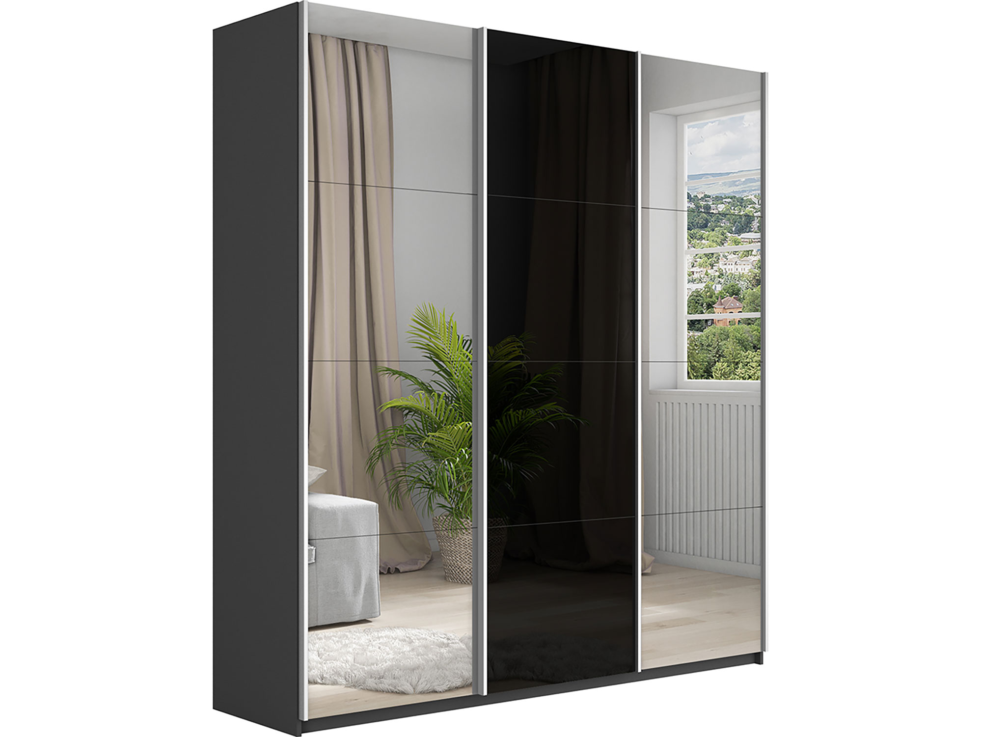 - Шкаф-купе Прайм 3-х дверный 2100 Зеркало/Стекло Черное/Зеркало Серый Диамант