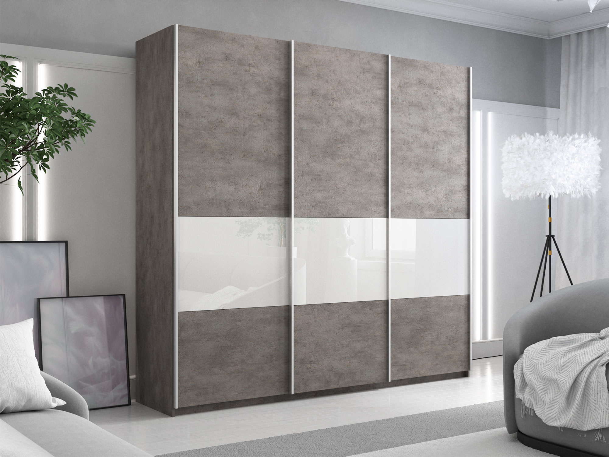 Шкаф-купе Прайм Широкий 3-х дверный ДСП/вставки Стекло Белое Бетон