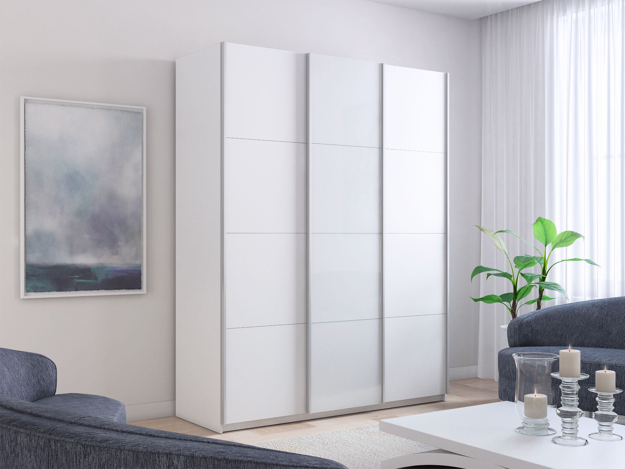 - Шкаф-купе Прайм Широкий 3-х дверный два ДСП/Стекло Белое Белый Снег