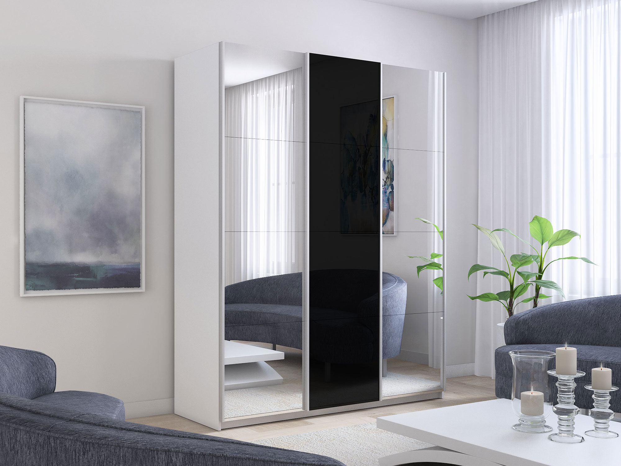 Шкаф-купе Прайм Широкий 3-х дверный два зеркала/стекло черное Белый Снег