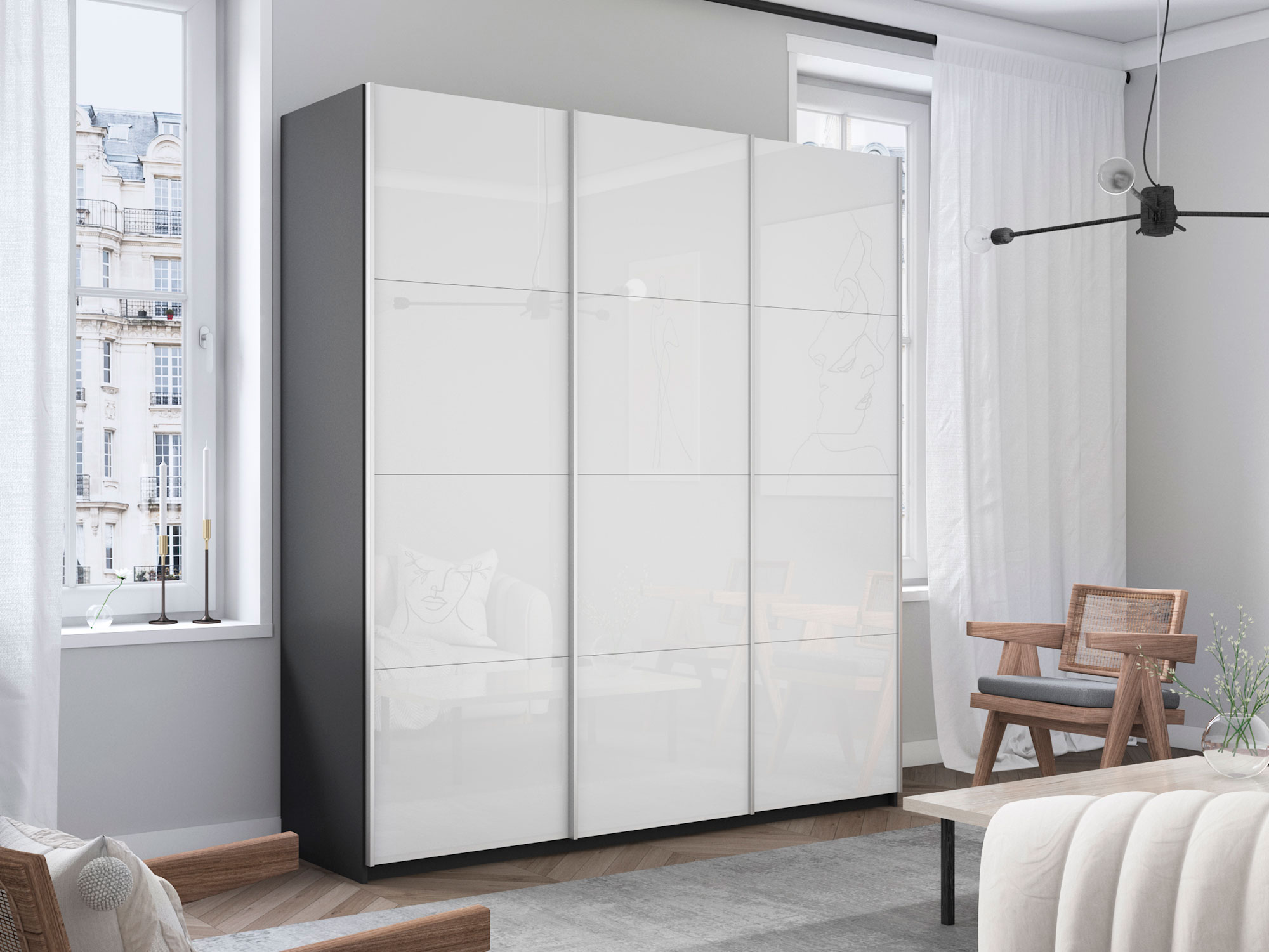 - Шкаф-купе Прайм Широкий 3-х дверный три белых стекла Серый Диамант