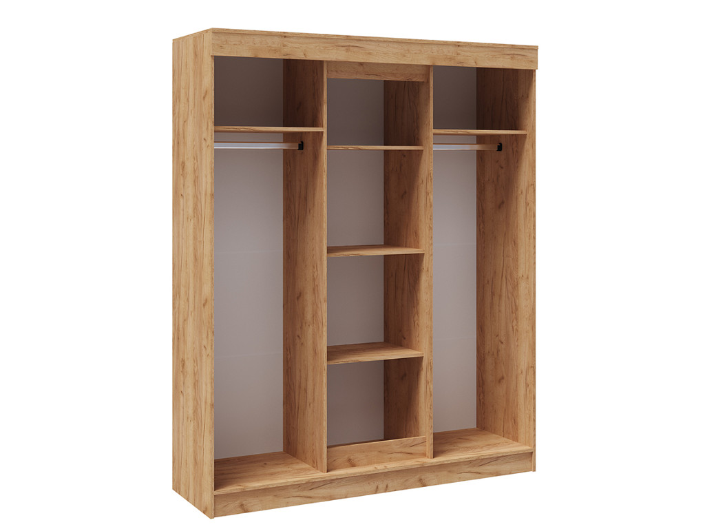 Внутреннее наполнение шкафов универсальное: по центру – отделение с полками, слева и справа стационарные металлические штанги.