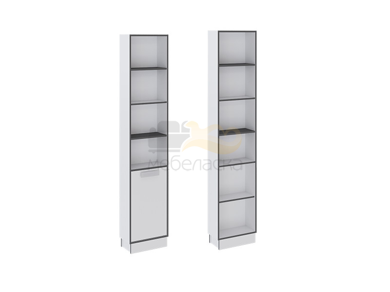 Шкаф с 4 открытыми отделами и дверью, декорирован серой кромкой.